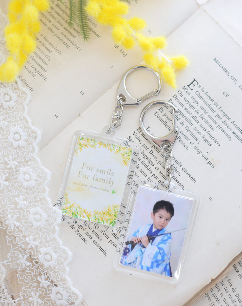 約5cm×3.5cmのフォトキーホルダー。“片面写真仕上げ”と“両面写真仕上げ”が選べます。バックに付けたり、車のキーに付けたり、おじいちゃんおばあちゃんへのプレゼントとしても人気の商品です。