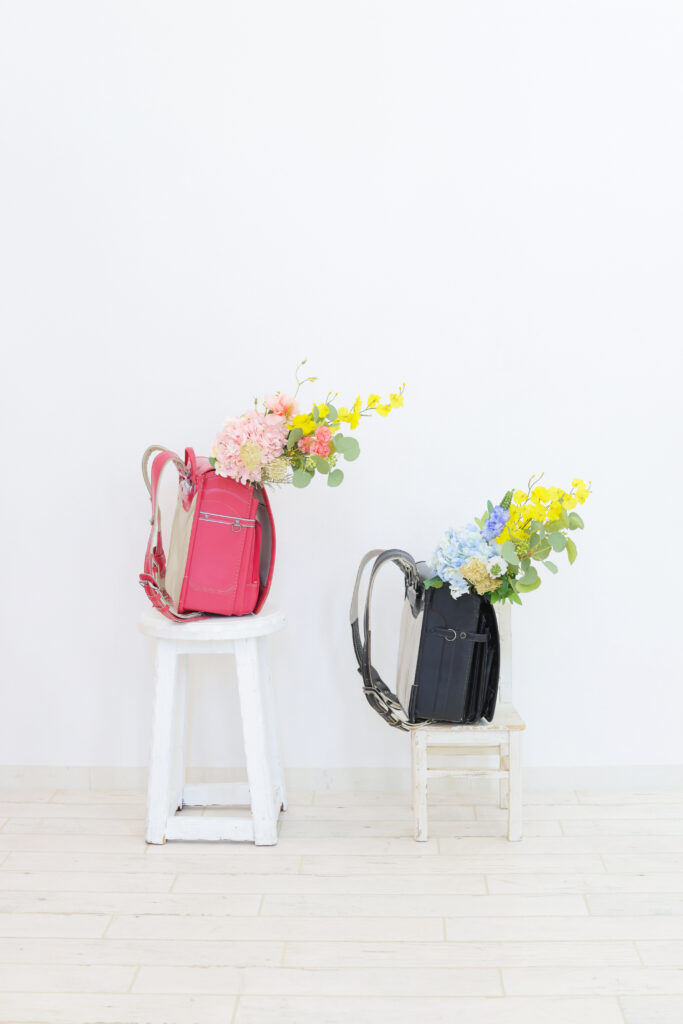 2026年、新登場!ランドセルとやさしい色合いの花束を添えて写真に残す。