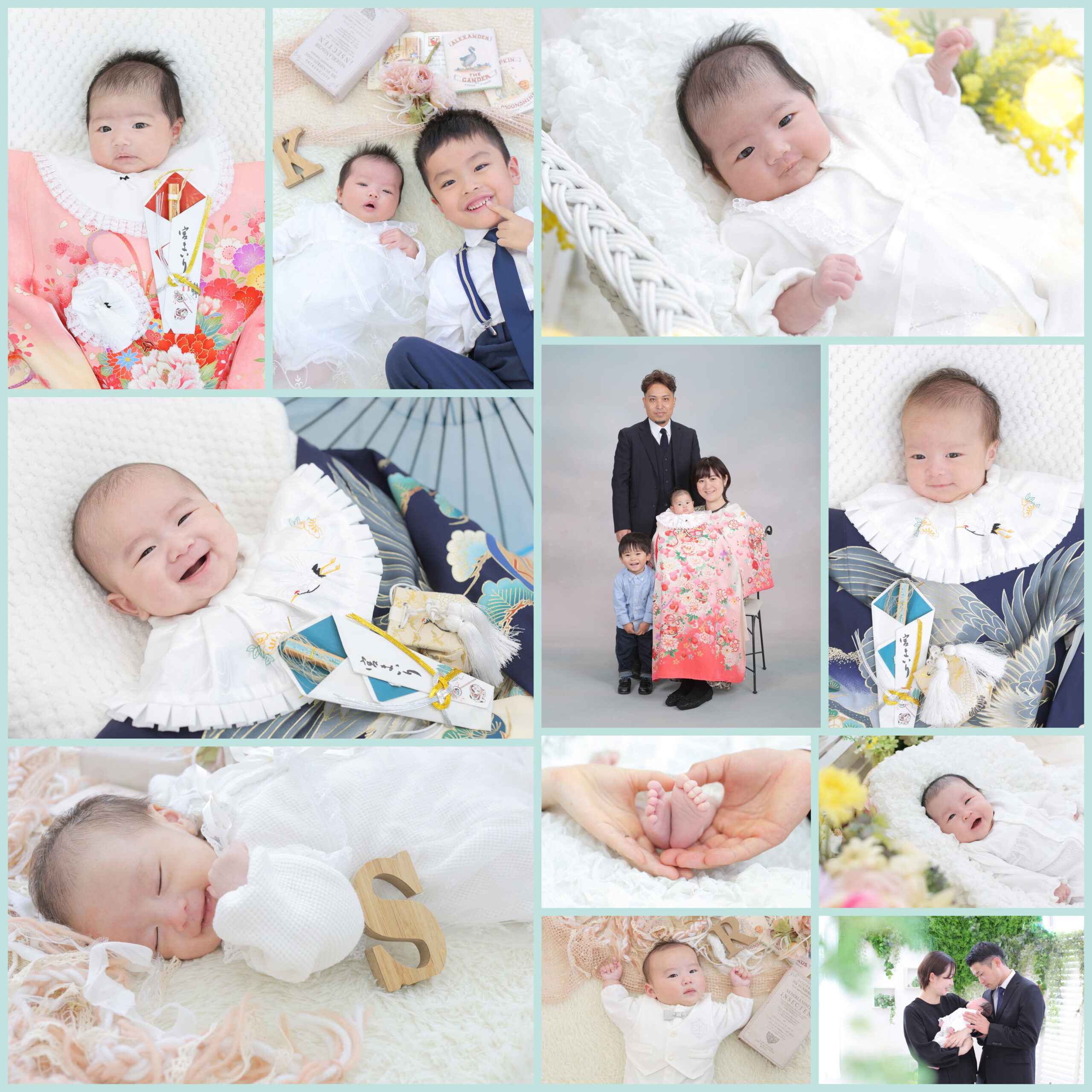祝着だけでなく、洋装(ベビードレス)の衣装レンタルも無料です。1階・2階のスタジオにて家族全員で撮影したり、きょうだい、本人のソロカットまで、赤ちゃんの様子にあわせて様々なパターンで撮影いたします。