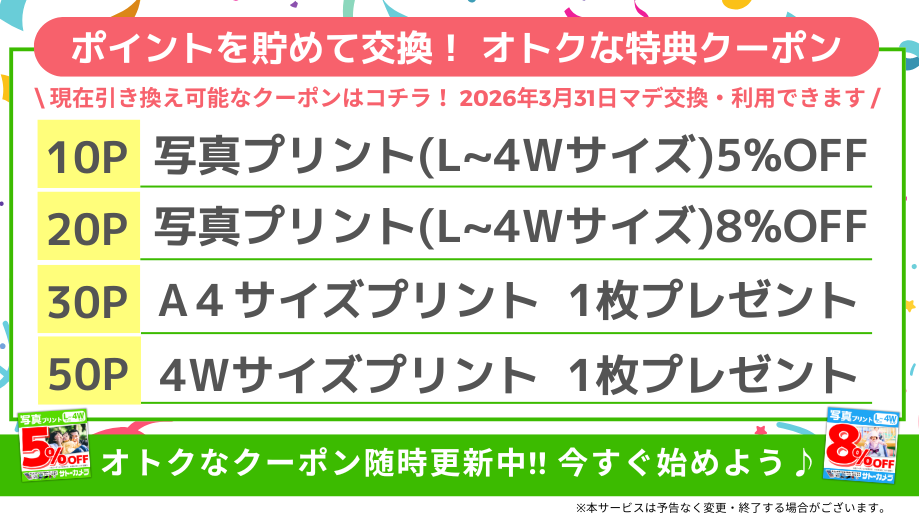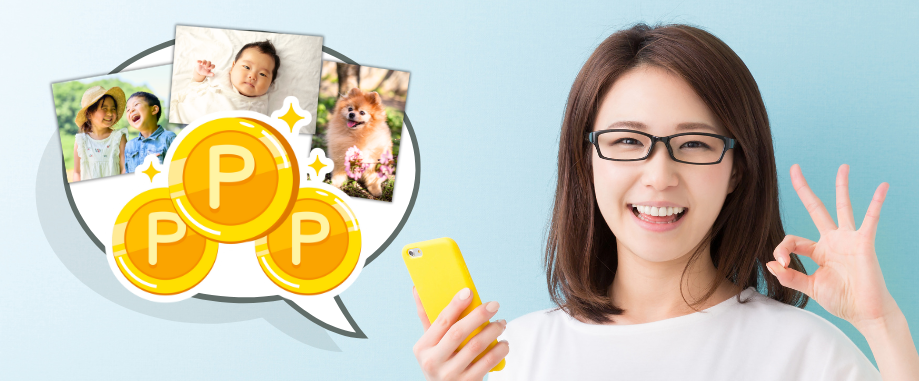 貯まったポイントは、写真プリントがオトクになるクーポンやドーンと大きな写真プリントに交換できます!